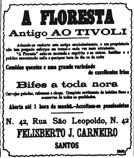 A Floresta (antigo Tivoli), de Felisberto J. Carneiro, na Rua São Leopoldo, 42: comidas quentes, excelentes frios, bifes à toda hora, bebidas, até 1 hora da manhã. Aceita pensionistas