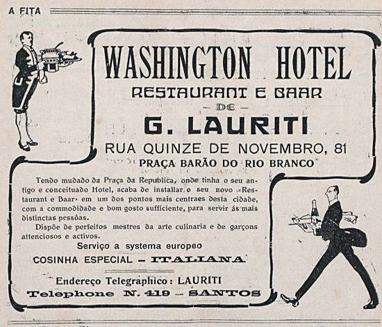 Washington Hotel, com novos restaurante e bar, de G. Lauriti, na Rua Quinze de Novembro, 81, junto à Praça Barão do Rio Branco