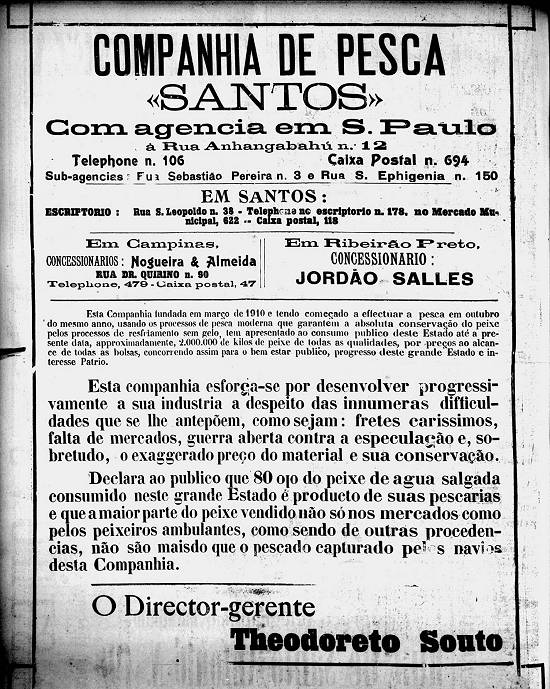 Companhia de Pesca 'Santos', fundada em março de 1910, declara que 80% do peixe de água salgada consumido no Estado de São Paulo é produto de suas pescarias