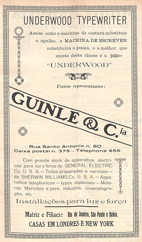 Underwood Typewriter, máquina de escrever, além de tintas preparadas e vernizes Sherwin Williams Co. U.S.A., telefones especiais, motores marinhos e industriais, cinematógrafo, instalações para luz e força, na Guinle & Cia., na antiga Rua Santo Antonio, 80