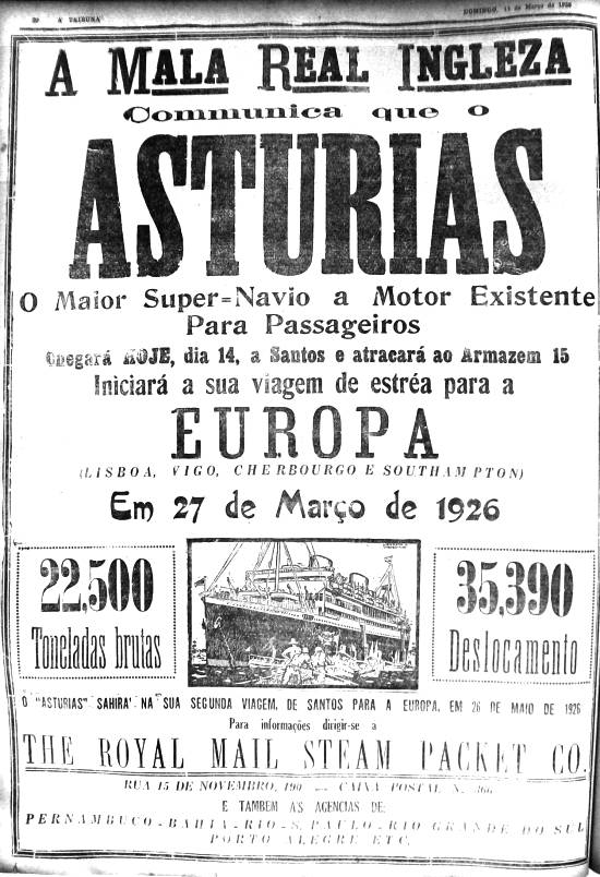 Viagem inaugural do transatlântico Asturias, da The Royal Mail Steam Packet Co.