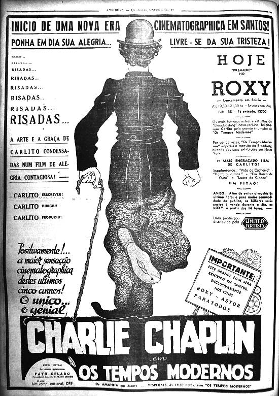 Cine Roxy - estréia de Carlitos (Charlie Chaplin) em Tempos Modernos Publicado no jornal santista A Tribuna em 8 de julho de 1936, página 12