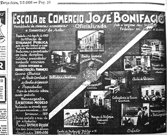 Escola de Comércio José Bonifácio/Faculdade de Ciências Econômicas e Comerciais de Santos Publicado no jornal santista A Tribuna em 7 de julho de 1936, página 10
