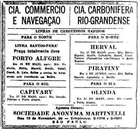 S/A Martinelli - agentes de Cia. Comércio e Navegação e Cia. Carbonífera Rio-Grandense Publicado no jornal O Estado de São Paulo em 21 de maio de 1936, pág. 12 (Acervo Estadão)