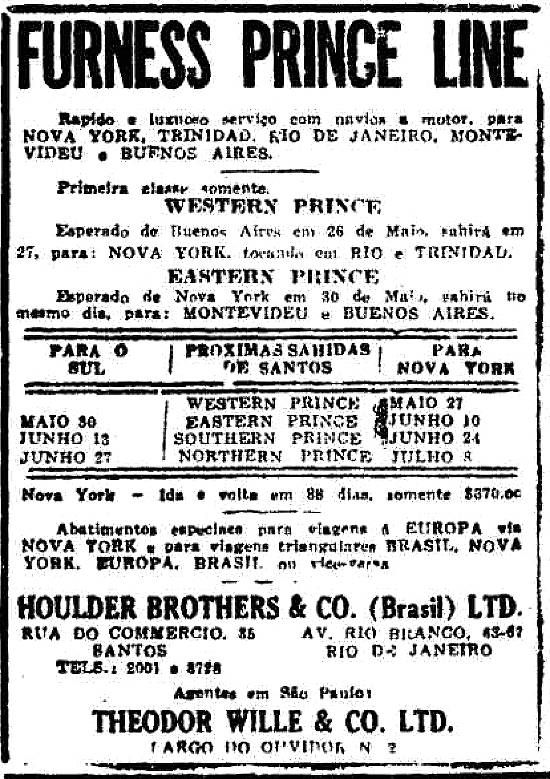 Houlder Brothers & Co. (Brasil) Ltd. -agentes da armadora Furness Prince Line Publicado no jornal O Estado de São Paulo em 21 de maio de 1936, pág. 12 (Acervo Estadão)