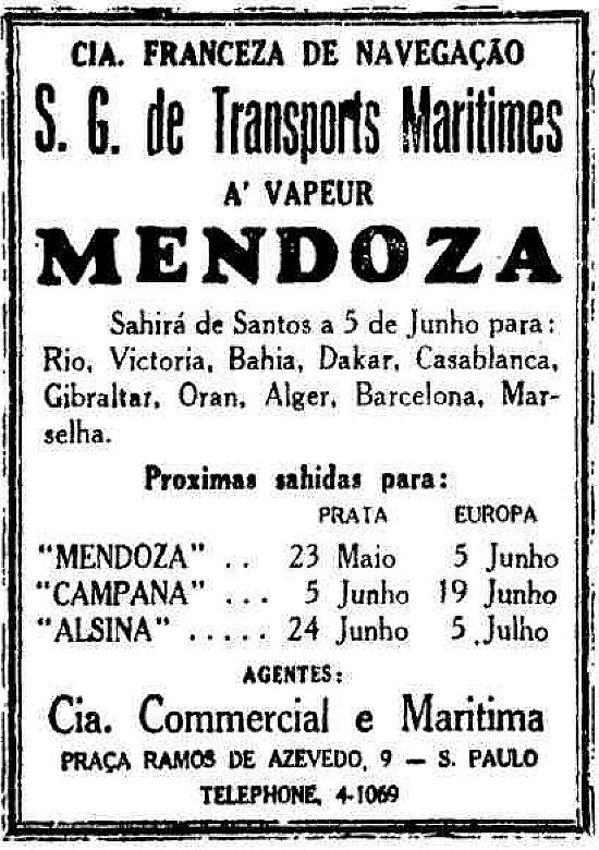 Cia. Commercial e Maritima - agentes da armadora francesa Société Générale de Transports Maritimes á Vapeur Publicado no jornal O Estado de São Paulo em 21 de maio de 1936, pág. 12 (Acervo Estadão)