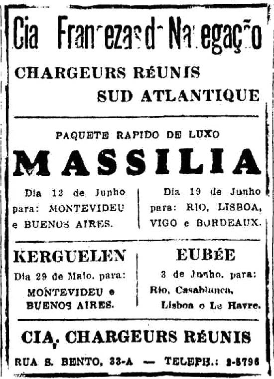 Cia. Chargeurs Réunis - agentes da armadora francesa Chargeurs Réunis Sud Atlantique Publicado no jornal O Estado de São Paulo em 21 de maio de 1936, pág. 12 (Acervo Estadão)