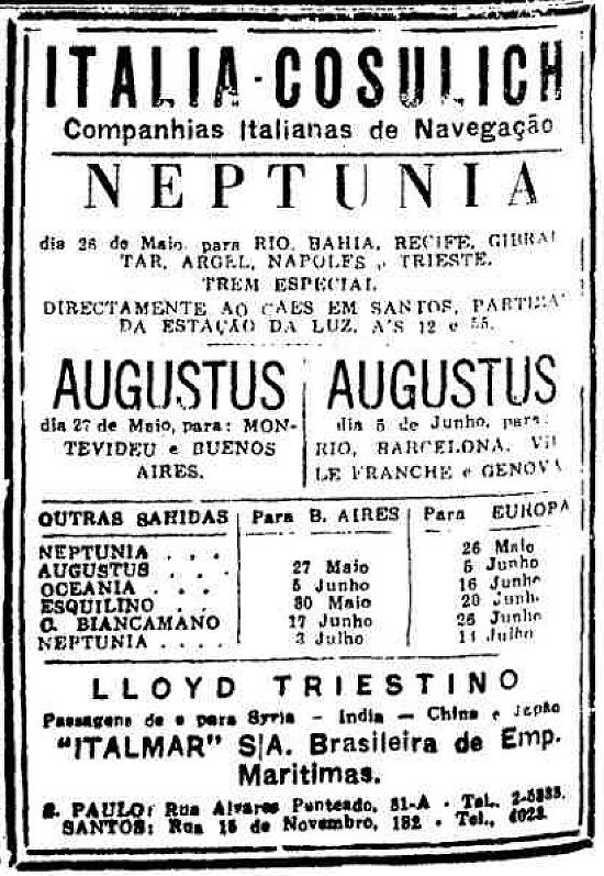 Italmar S/A Brasileira de Empresas Marítimas - agentes de Italia-Cosulich/Lloyd Triestino Publicado no jornal O Estado de São Paulo em 21 de maio de 1936, pág. 12 (Acervo Estadão)