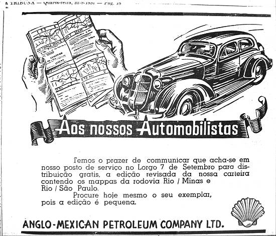 Anglo-Mexican Petroleum Company Ltd. - distribuição de mapas rodoviários Publicado no jornal santista A Tribuna, em 22 de setembro de 1937, página 13