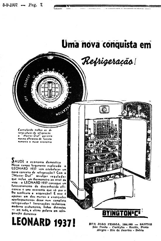 Byington & Co. - geladeira Leonard 1937 Publicado no jornal santista A Tribuna, em 5 de setembro de 1937, página 7