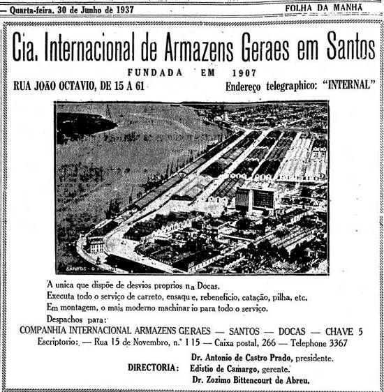 Cia. Internacional de Armazens Geraes em Santos - fundada em 1907 Publicado no jornal paulistano Folha da Manhã de quarta-feira, 30 de junho de 1937, página 34 (Acervo Folha - acesso em 13/1/2013)