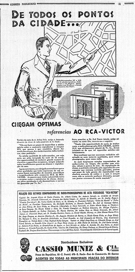 Cassio Muniz & Cia. - distribuidores exclusivos dos radiofonógrafos de alta fidelidade RCA Victor Publicado no jornal paulistano Correio da Manhã de domingo, 27 de junho de 1937, ed. 24.935, página 11 (Acervo Biblioteca Nacional - acesso em 23/6/2017)