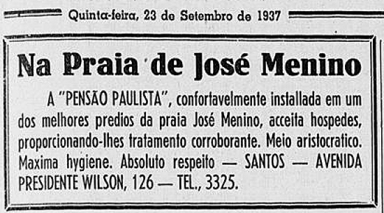 Pensão Paulista, "atendimento corroborante" na praia do José Menino Publicado no jornal paulistano Correio da Manhã de domingo, 23 de setembro de 1937, ed. 25.010, página 7 (Acervo Biblioteca Nacional - acesso em 23/6/2017)