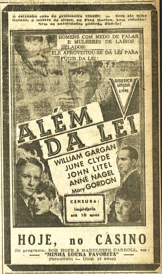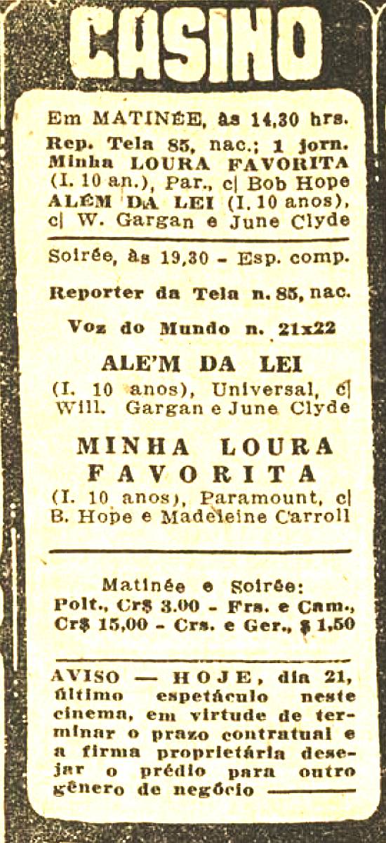 Aviso do encerramento das atividades do cine Casino na noite de 21/2/1943