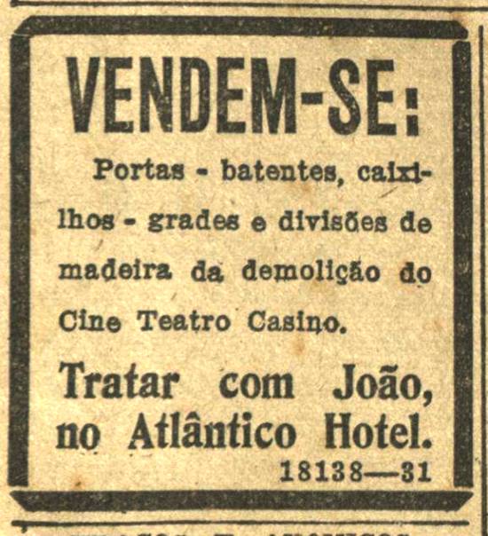 Anúncio classificado, na página de Cinemas, sobre venda de materiais de demolição do cine Casino - tratar com João, no Atlântico Hotel