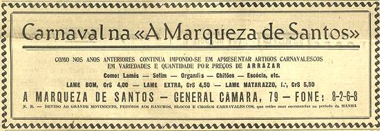 Tecidos e artigos de carnaval na loja "A Marqueza de Santos": "Devido ao grande movimento, pedimos aos ranchos, blocos e choros carnavalescos que retirem suas encomendas no período da manhã"