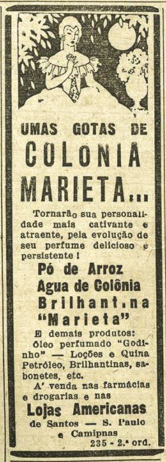 Colônia Marieta e outros produtos,, "à venda nas farmácias, drogarias e nas Lojas Americanas"