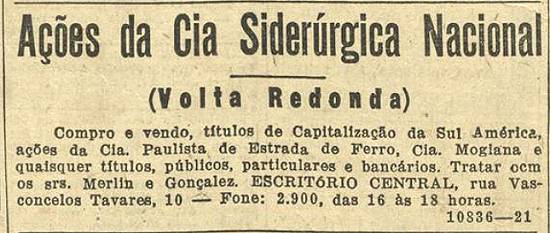 Compra e venda de ações da Companhia Siderúrgica Nacional (Volta Redonda) e outras, tratar com Merlin e Gonçalez no escritório da Rua Vasconcelos Tavares, 10