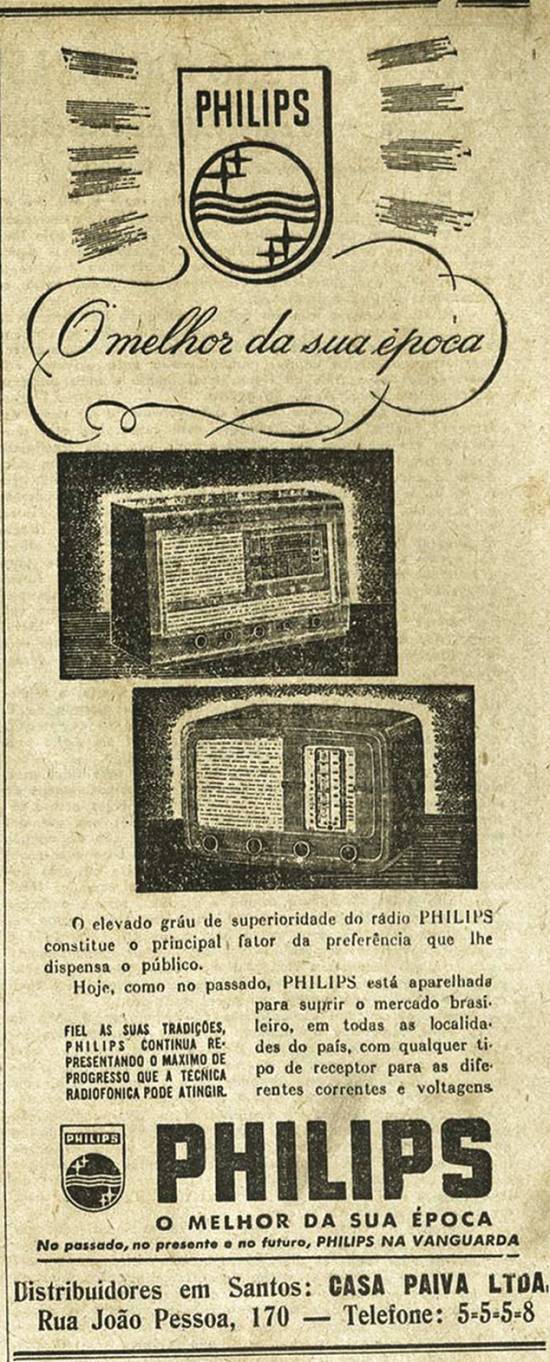 Rádio Philips, "O melhor da sua época" - distribuidores em Santos: Casa Paiva Ltda., Rua João Pessoa, 170