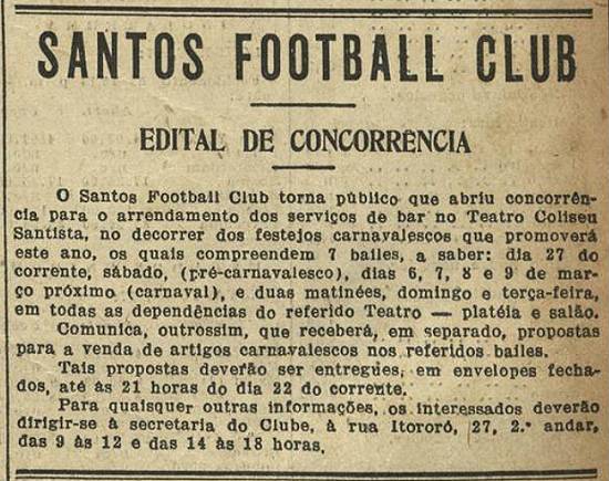 Santos Football Club arrenda serviço de bar e venda de itens carnavalescos em seu baile no Teatro Coliseu