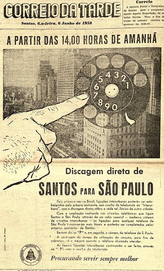 Companhia Telefônica Brasileira (CTB) - "A partir das 14 horas de amanhã - Discagem direta de Santos para São Paulo"