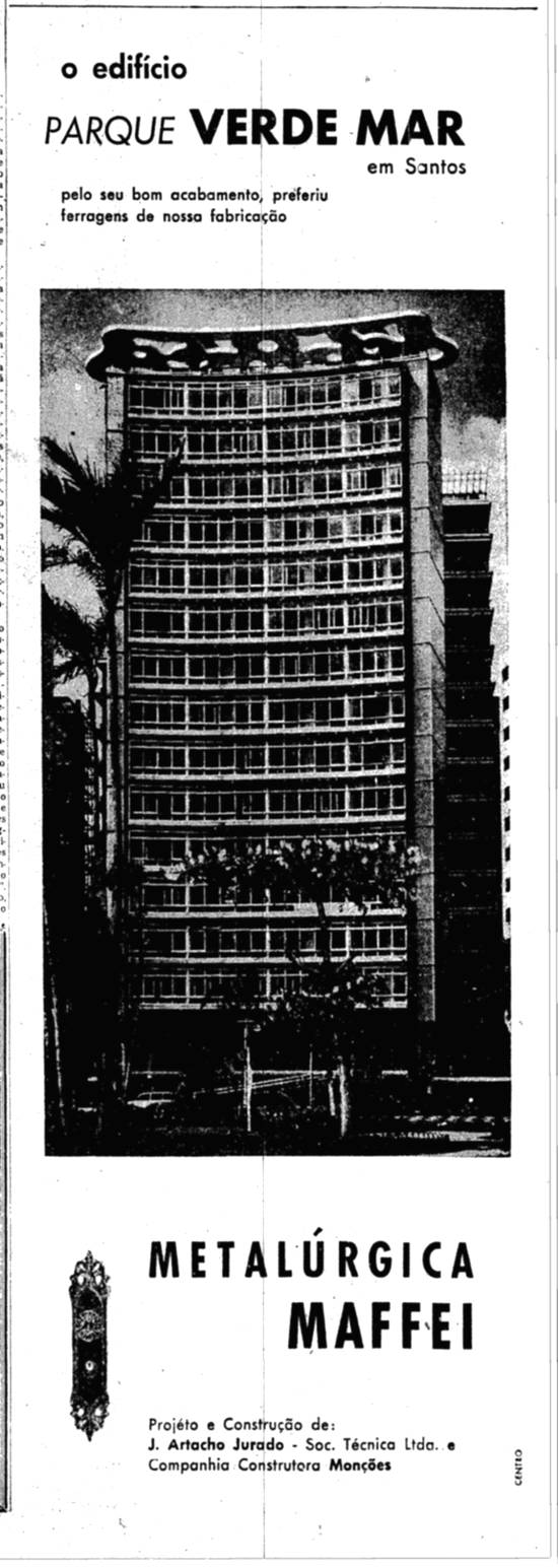 Metalúrgica Maffei, participando da obra do Edifício Parque Verde Mar, projetado por J. Artacho Jurado Soc. Técnica Ltda. e e Companhia Construtora Monções