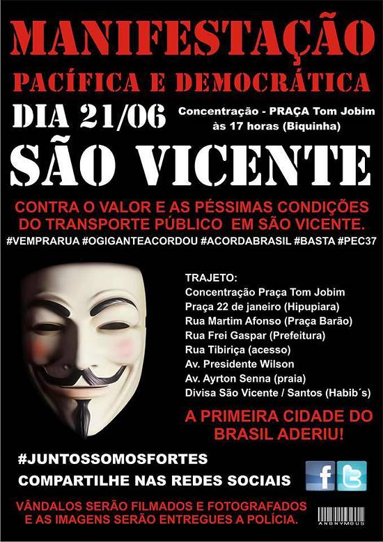 Protesto nacional em São Vicente - convocação divulgada na rede social FaceBook, na Internet