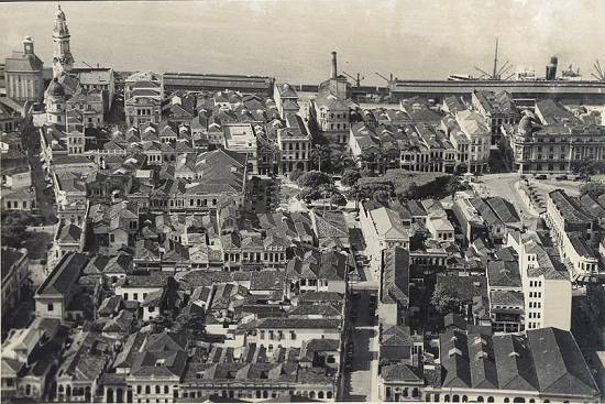 Bolsa do Café e prédio da Western junto ao porto (à esquerda) e Praça Mauá no centro da foto, com a Rua Riachuelo em destaque na vertical, em foto obtida desde o Monte Serrat, sem data, possivelmente 1934.