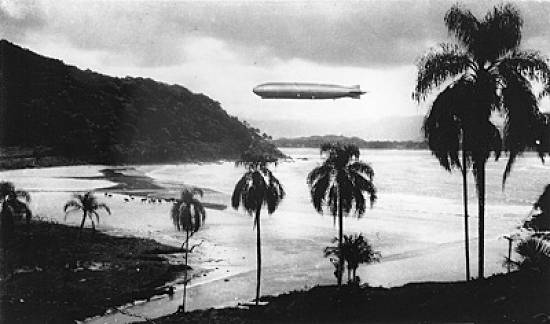 O dirigível alemão Graf Zeppelin sobrevoando as praias de São Vicente, em 1933
