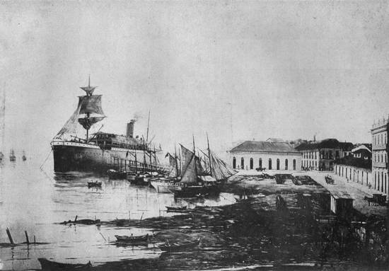 "A Rua Xavier da Silveira, em 1890, junto ao Paquetá. Atualmente esta praia foi substituída pela Companhia Docas, que se estende deste ponto até 2 quilômetros acima"