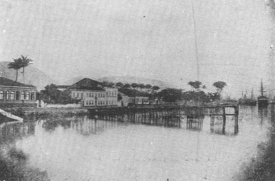 "A praia do Consulado em 1889. O casebre visto sobre a ponte era a mesa de Rendas. Atualmente neste trecho encontra-se o grande edifício da Western Telegraph Co.,