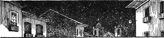 Na sombra passam vultos embuçados em mantéus, voejam abas de pelotes e as nódoas escuras e piramidais das mantilhas resvalam na penumbra. Das rótulas gradeadas como