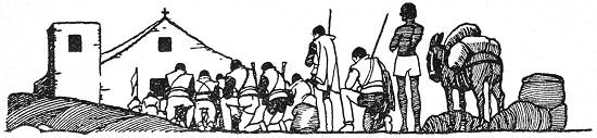 No adro espaçoso e empedrado, reúne-se a Bandeira; homens grandes e escuros, de rostos rudes como troncos, trazem uma cruz de peito e um arcabuz de lado e rezam baixo de