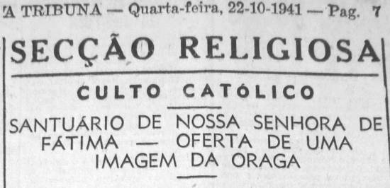 de fazer entrega à nova direção do Santuário de Nossa Senhora de Fátima de uma bela imagem de sua oraga, que mandou executar pelo escultor Marino