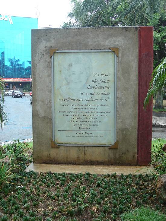 Nesse monumento, o texto: "As rosas não falam/Simplesmente as rosas exalam/O perfume que roubam de ti - Porque se as rosas falassem diriam da tua grandiosidade, da tua beleza, da tua bondade. Cantariam em versos e prosas os mais belos poemas de amor. Diriam aos anjos do céu que encontraram na terra uma mulher em forma de flor. Uma flor única e bela chamada Rosinha. Que entre pedras e espinhos desabrochou." Junto, uma placa metálica colocada pelo INSS em 2002 se refere à parceria entre a universidade e o governo estadual para a conservação daquela área: