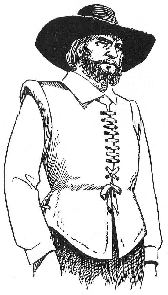 Bandeirante com gualteira de couro de anta, gibão de armas, rodela, espada, arcabuz e forquilha