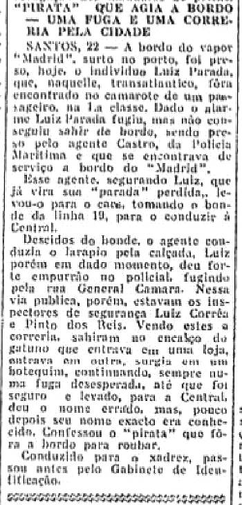 22 - A bordo do vapor Madrid, surto no porto, foi preso, hoje, o indivíduo Luiz Parada, que, naquele transatlântico, fora encontrado no camarote de