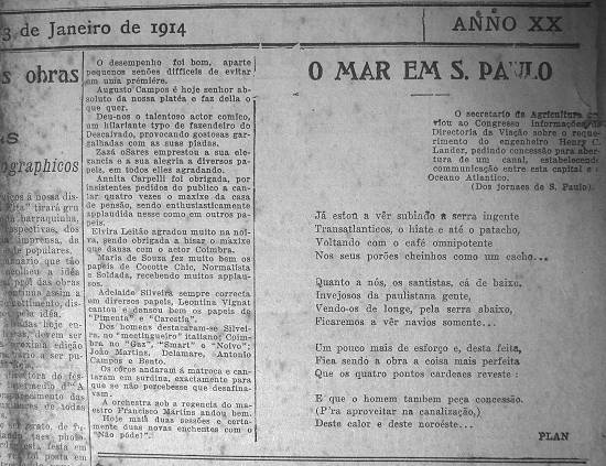 O tema voltou ao noticiário no início do ano seguinte, como registrou - num editorial em versos assinado por "Plan" - o jornal santista A Tribuna, em 3 de janeiro de 1914 (página 1 - ortografia atualizada nesta transcrição):