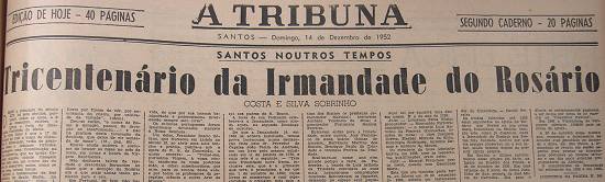 Uma das mais antigas irmandades religiosas de Santos, iniciada em 1652, teve a sua extinção decidida em junho de 2008, em ato tão discreto que não foi percebido pela imprensa local, e seu valioso patrimônio - inclusive a Igreja de Nossa Senhora do Rosário (então completando 250 anos de existência) - transferido para a Mitra Diocesana. Sobre essa Irmandade, o pesquisador Costa e Silva Sobrinho escreveu este artigo, publicado no jornal santista A Tribuna num domingo, 14 de dezembro de 1952, nas páginas 21 e 24 - 2º caderno - depois republicado como parte da obra Romagem pela Terra dos Andradas (ortografia atualizada nesta transcrição):