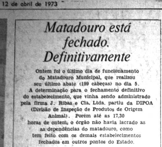 no dia 11, o Matadouro Municipal, que nos últimos anos esteve sob a direção da firma J. Ribas e Cia. Ltda. A decisão foi tomada pela Dipoa -