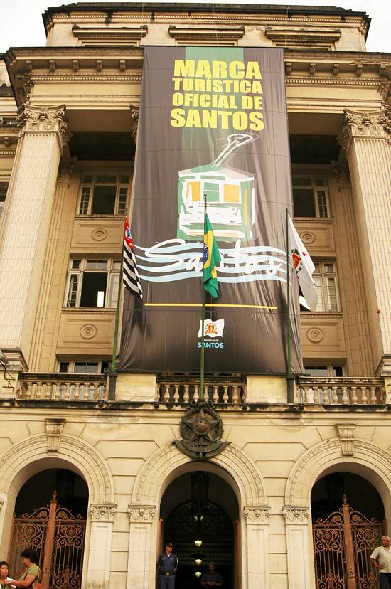 Marca turística é exposta na fachada do Palácio José Bonifácio, sede da Prefeitura de Santos