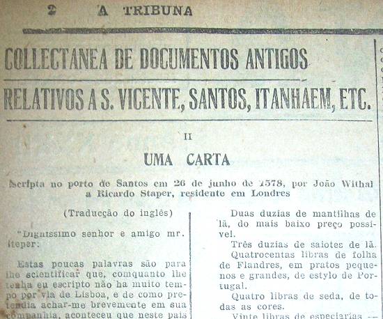 Escrita no porto de Santos em 26 de junho de 1578, por João Withal a Ricardo Staper, residente em Londres