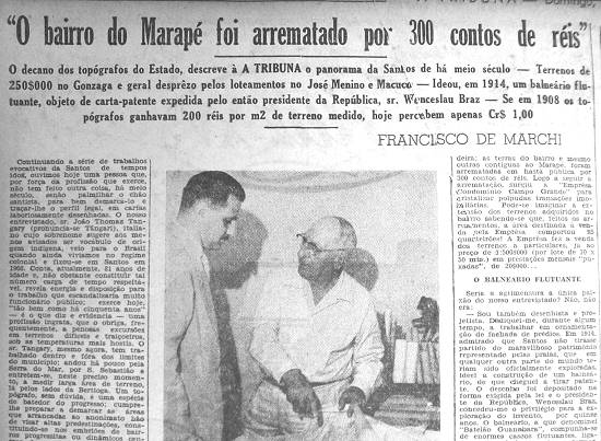O descaso dos topógrafos do Estado, descreve à A Tribuna o panorama de Santos de há meio século – Terrenos de 250$000 no Gonzaga e geral desprezo pelos loteamentos no José Menino e Macuco – Ideou, em 1914, um balneário flutuante, objeto de carta-patente expedida pelo então presidente da República, sr. Wenceslau Braz – Se em 1908 os topógrafos ganhavam 200 réis por m² de terreno medido, hoje percebem apenas Cr$ 1,00