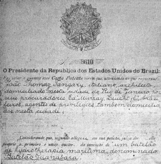 Reprodução do cabeçalho da Carta-Patente expedida ao "arquiteto" João Thomaz Tangary e que diz respeito ao balneário ideado por esse senhor. O privilégio para a exploração da invenção – já caduco – foi concedido pelo presidente da República, Wenceslau Braz Pereira Gomes, trazendo ainda a assinatura do famoso Pandiá Calógeras, o grande brasileiro que então era ministro da Guerra