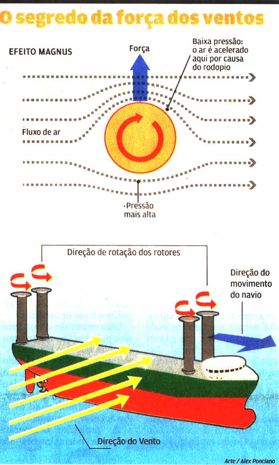 "Uma corrente de vento (força transversal) sobre um corpo girando gera o efeito Magnus. Cada um dos rotores tem um motor atuando embaixo. O efeito do vento sobre os rotores em movimento proporciona a