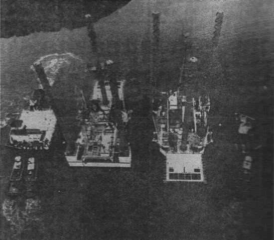 Paralelamente, em Santos, as plataformas petrolíferas foram preparadas para a viagem com a passagem de cabos, testes finais etc., desde as 9 horas do dia 7. Às 11h30 saiu a Ocean Master V, rebocada pelo Phoenix, e às 12h30 saiu a