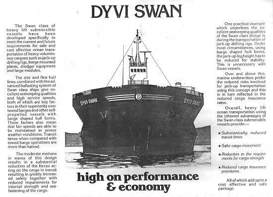 A classe de embarcações Dyvi Swan foi desenvolvida especialmente para atender às atuais e futuras necessidades de segurança e custo no transporte oceânico de cargas volumosas e pesadas, como plataformas marítimas de prospecção de petróleo,