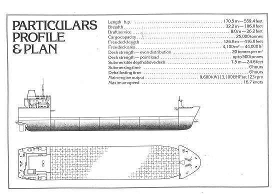 Os navios desse tipo possuem as seguintes características construtivas: comprimento entre perpendiculares, 170,5 m; largura, 32,2 m; calado de serviço, 8 m; comprimento da área livre do convés, 126,8 m, e área total livre no convés de 4.100 metros