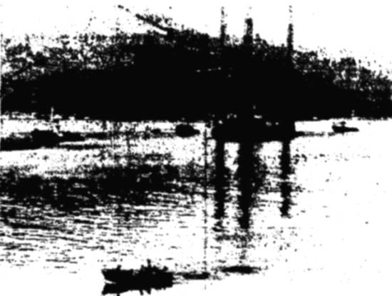 amarrações finais visando deixar a plataforma na posição correta. Para atingir a proa do navio, os marinheiros encarregados do controle dos cabos enviados à plataforma passaram por um túnel sob o convés, que liga a proa à popa.