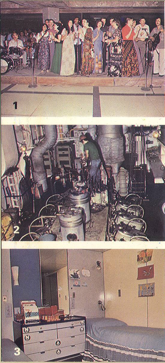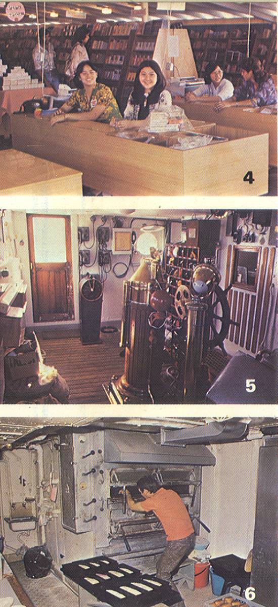 O Doulos; [1] Os cantores do navio; [2] A sala de máquinas; [3] Um camarote; [4] A exposição; [5] A ponte de comando; [6] A padaria do navio